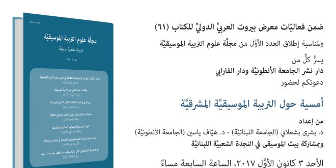 ضمن فعاليّات معرض بيروت العربيِّ الدوليِّ للكتاب (61) ولمناسبة إطلاق العدد الأوَّل من مجلَّة علوم التربية الموسيقيَّة تدعو دار نشر الجامعة الأنطونيَّة ودار الفارابي الى أمسية حول التربية الموسيقيَّة المشرقيَّة من إعداد الدكتور بشرى بشعلاني )الجامعة اللبنانيَّة( والدكتور هيّاف ياسين )الجامعة الأنطونيَّة( وبمشاركة بيت الموسيقى في النجدة الشعبيَّة اللبنانيَّة. تقام الأمسية يوم الأحد 3 كانون الأوَّل 2017 عند الساعة السابعة مساء في جناح دار الفارابي.