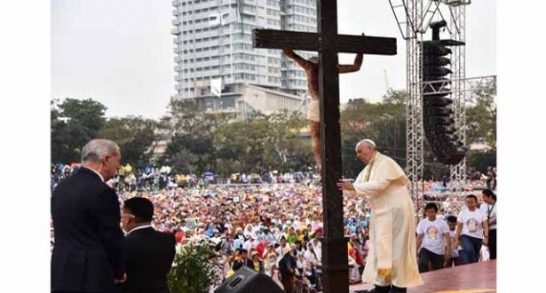 البابا فرنسيس يصلي عند صليب كبير في جامعة سانتو توماس الكاثوليكية في مانيلا. (أ ف ب)